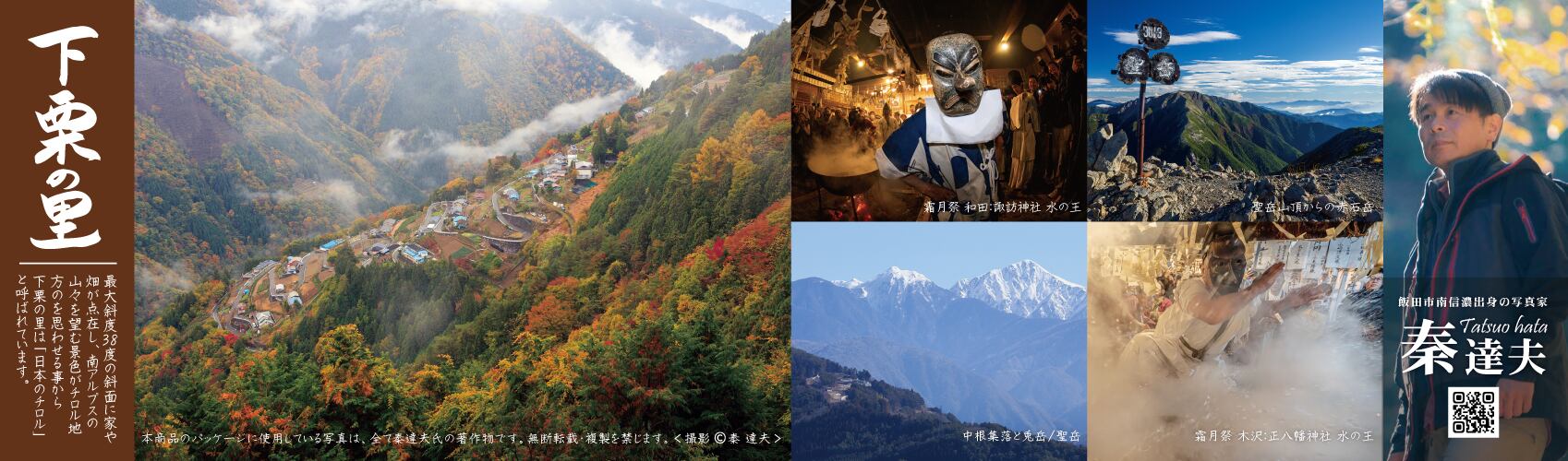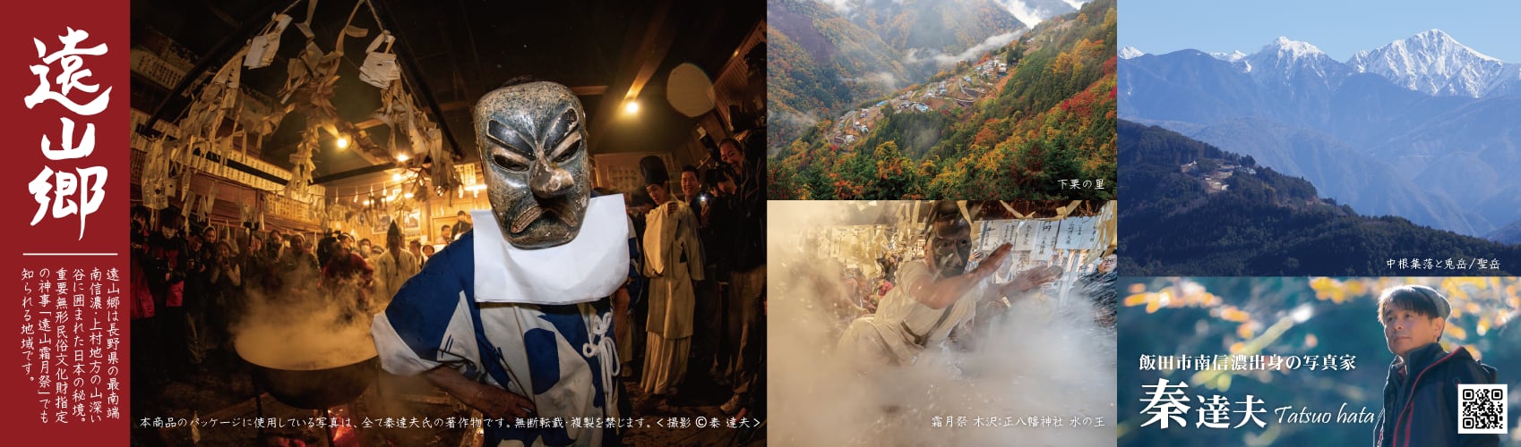 商品のパッケージは、保存会の会員で、霜月祭りの記録写真撮影を担い、全国的に活躍する写真家、秦達夫氏(飯田市南信濃出身)の作品を使用し、「遠山郷カレー」「下栗の里カレー」「聖岳カレー」の3種類で展開。パッケージの裏面は秦さんが撮影した遠山郷に関連した作品のミニ写真集としてのデザインになっています。カレーの大原屋ネットショップでは、この3種類をセットにして通信販売でご提供しています。